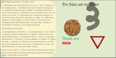 1. Wladiwostok 2. Der d¨mmste und gefährlichste Mensch, der je gelebt hat 3. it sucks 4. Bööse 5. Faulheit 6. Pilzrisottoapocalypse (die Geschichte von Paulinchen P.) 7. Mächthild möcht halt 8. Namen 9. feelings for G. 10. Loyalität der Schmidt und der Schillinger 11. die andere Wahrheit 12. Es ist noch nicht alles vorbei 13. Sunday Evening 14. I am not a danger for you, but you are a danger for me 15. der Traum 16. die Flucht 17. kaltes Kalzium 18. fucking with a machine 19. nein pt.1 20. light in the night 21. Der Affe 22. Geister 23. Anfahrt nach Hamburg 24. Seemannsgarn 25. Häh 26. fett 27. von Ausreden und Ohnmacht des, der Übersicht beraubten 28. suffer allone 29. Nein pt.2 30. Blutmond 31. Nein pt. 3 32. der letzte schöne Tag im Jahr Disk 2 1. Elan (Nightwish-Cover) 2. Zehn (F.U.R.T. - Cover) 3. Greensleeves (Trad.) 4. Time (Tom Waits - Cover) 5. bad day (Daniel Powter - Cover) 6. Bobby Brown (Frank Zappa - Cover) 7. Road to nowhere (by David Byrne, Talking heads - Cover) 8. Cambodia (Kim Wilde - Cover) 9. Europa 10. Hallo Maus (Nickerbocker (& Biene) - Cover) 11. OK (F.U.R.T. - Cover) 12. Call me (Blondie - Cover) 13. Mother (Pink Floyd - Cover) 14. gehen die Leute auf der Straße eigentlich absichtlich so langsam 15. Bad boys running wild (Scorpions-Cover n. world wide live Songbook) 16. wake me up, when September ends (Take2) (Green Day - Cover) 17. Bossanova (frei nach Quincy Jones) 18. Judas (Helloween-Cover) 19. We are the others (Delain-Cover) Vielen Dank an alle, die zu diesem Album gedient und beigetragen haben. Die Texte stammen aus dem Jahr 2022. Die Melodien und Aufnahmen sind von 2024. (c)2025 Alexander Voigts |